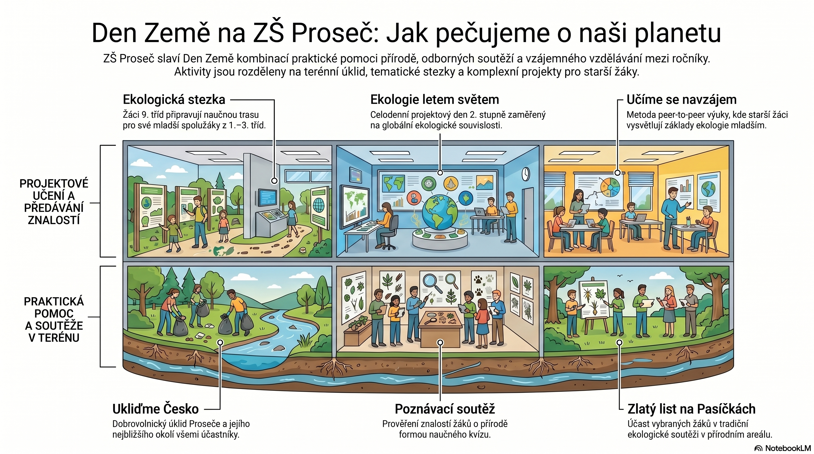 Pro žáky prvního stupně si deváťáci připravili zábavná stanoviště s tematickými úkoly. Děti si tak mohly hravou formou vyzkoušet třídění odpadu, dozvědět se zajímavosti o přírodě a zamyslet se nad tím, jak každý z nás může přispět k ochraně životního prostředí. Žáci druhého stupně se zapojili do úklidu okolí školy a obce. Jednotlivé třídy si zvolily svůj rajon, ve kterém sbíraly odpadky a pomohly tak zlepšit prostředí, ve kterém žijeme. Osmáci navštívili čističku odpadních vod, kterou je provedl pan Soukal.