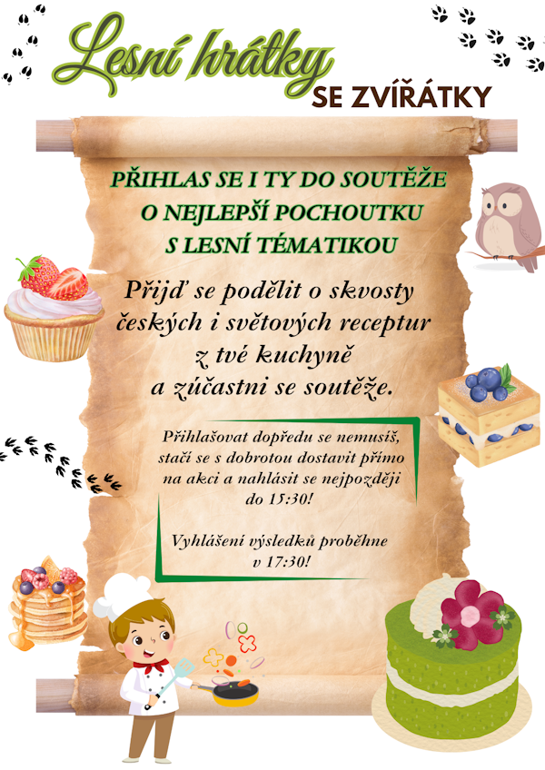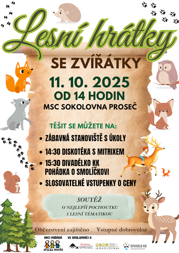 Spolek rodičů při Základní škole a mateřské škole Vás srdečně zve na Lesní hrátky se zvířátky! Přijďte se s námi pobavit, zatancovat si s MITRIXEM, podívat se na divadlo, vyhrát pěknou cenu a zúčastnit se soutěže o nejlepší dobrůtku s lesní tématikou! Těšíme se na Vás!